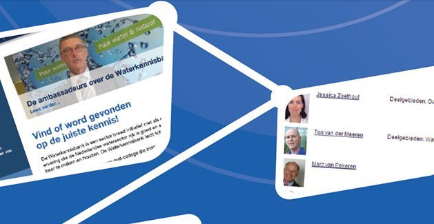 De Waterkennisbank ontsluit kennis die in mensen zit. Iedereen heeft wel een la vol met rapporten. Maar wat nou als je de schrijver van dat rapport alles mag vragen? Met dat uitgangspunt verbonden wij jarenlang honderden waterprofessionals, organiseerden meeloopdagen en uitwisselingen in de wereld van de waterschappen, drinkwaterbedrijven en andere aanverwante organisaties. Met een digitale community als startpunt, en een warme kennismaking als eindpunt.